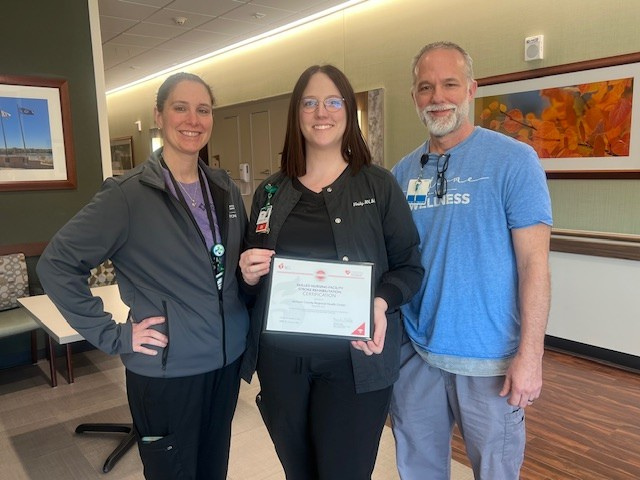 JCRHC colleagues proudly show the certificate recently received for Skilled Nursing Facility Stroke Rehabilitation Certification from the American Heart Association. Pictured with the certificate are Brittany McCormick, Physical Therapy & Wellness Manager; Haily Hoffman, Outcomes Coordinator; and Mark Ferguson, Physical Therapist.