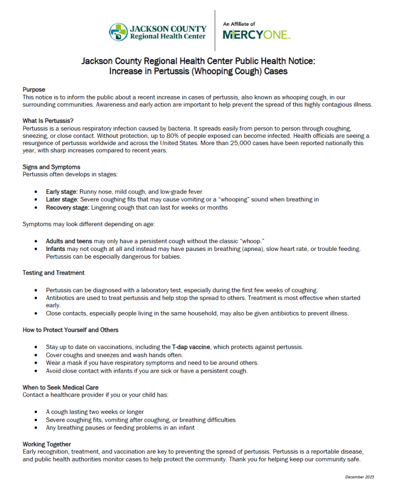 JCRHC Public Health Notice: Increase in Pertussis Cases